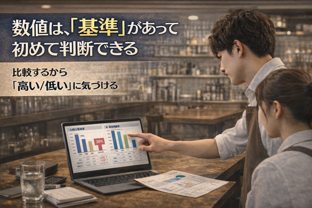 考えてみてください。私たちが原価率35%と聞いて「ちょっと高いね」と感じるのは、「飲食店の原価率は一般的に30%ぐらい」という”基準値”を無意識に持っているからこそ、それと比較して「高い」と判断するわけです。