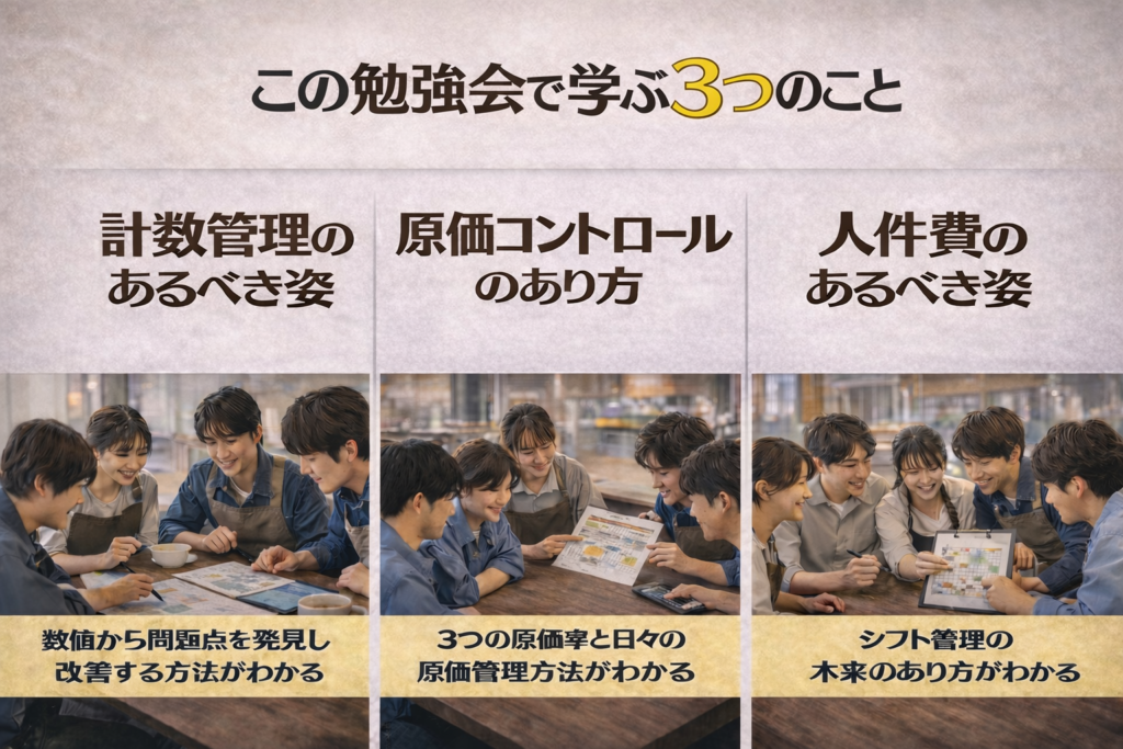 原価管理の鍵は、「3つの原価率」を知り、どう管理すべきかを明確にすること。3つの原価率をどう管理すべきかについて、なぜ、原価率は上昇するのかなどを踏まえながら、原価コントロールのあり方について学んでいただきます。