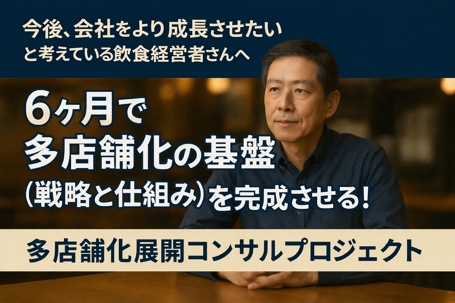 この「多店舗化展開コンサルプロジェクト」は、経営者が思い描く多店舗展開を実現するために、戦略策定から仕組みづくりまでの基盤構築を6か月で行うプロジェクトです。