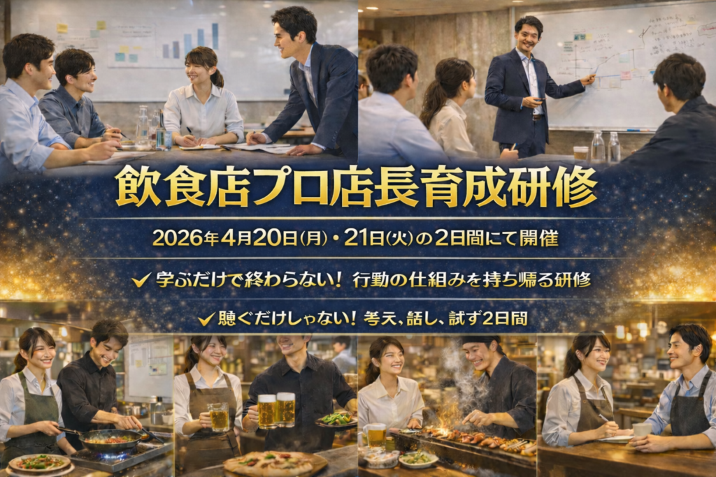 ここで紹介している動画を「リアルの場」で学び、店に戻って確実に使える知識、スキルを学べる研修が当社の「飲食店プロ店長育成研修」。詳しくはこちら>>>